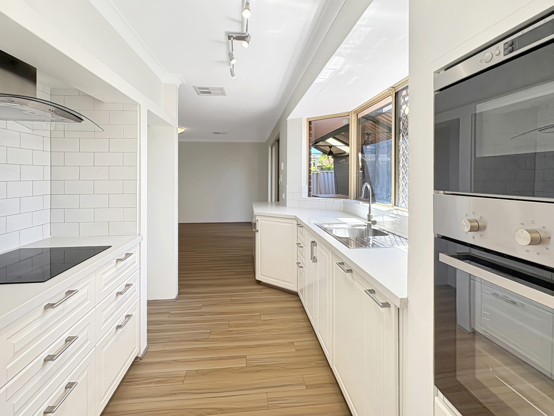 A window above the kitchen sink overlooking the decked patio, filling the space with natural light
