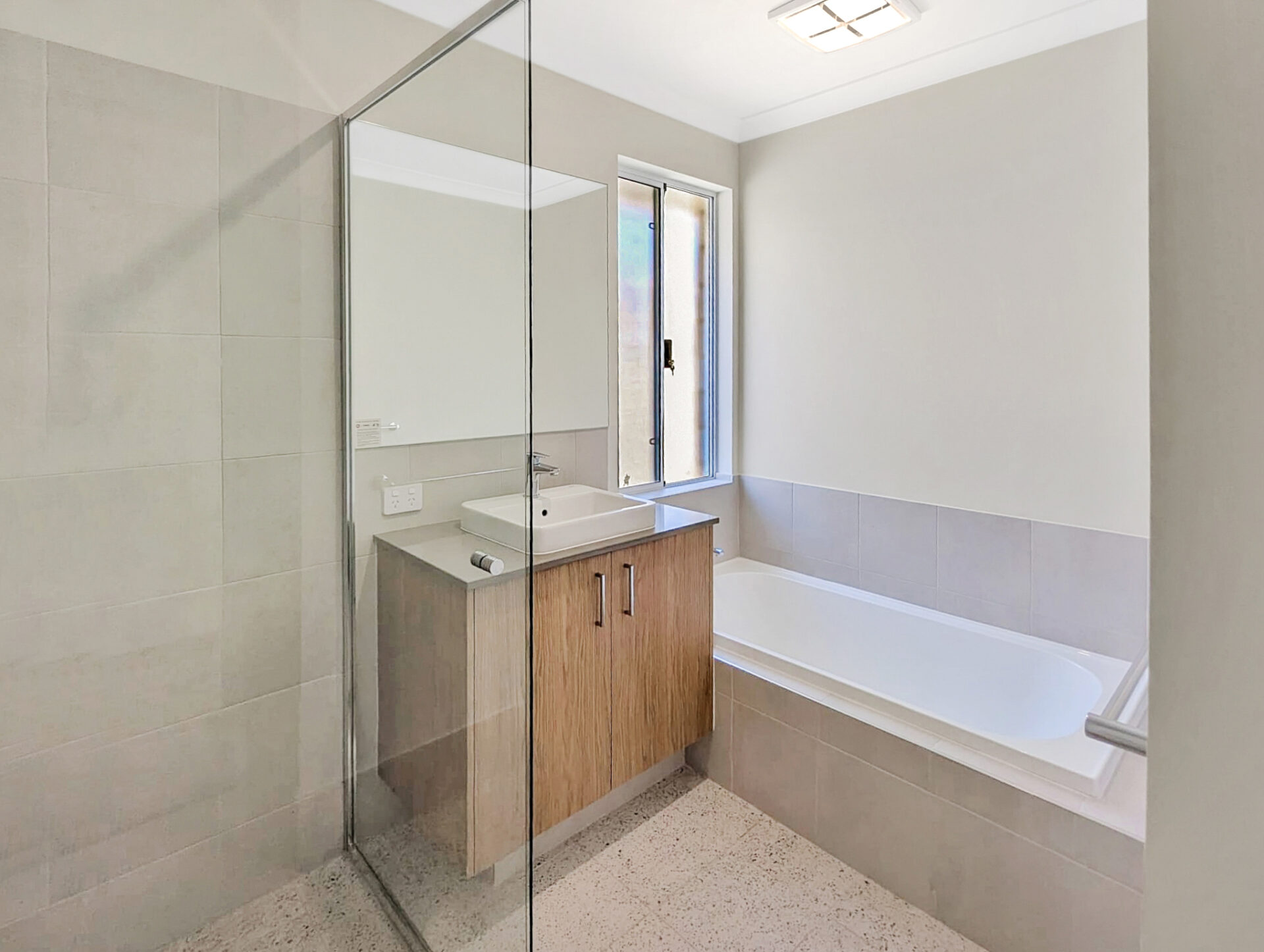 The master suite is privately positioned and includes a spacious walk-in robe and a sleek ensuite bathroom, creating a true retreat for parents. The three minor bedrooms are all generously sized and come complete with built-in robes, serviced by a central bathroom featuring a full-size bath, shower, and vanity.