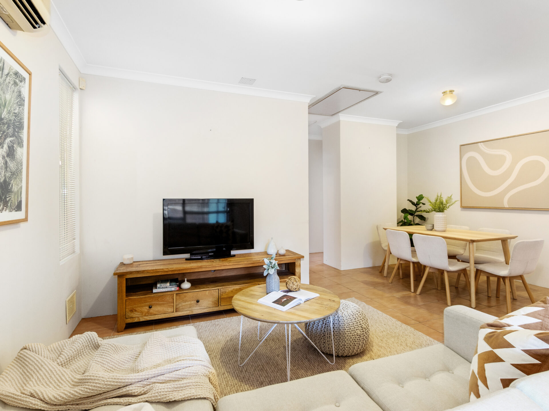 The heart of the home is the open-plan living, dining, and kitchen area, perfect for family gatherings or casual meals. This area is equipped with air conditioning, ensuring comfort all year round.