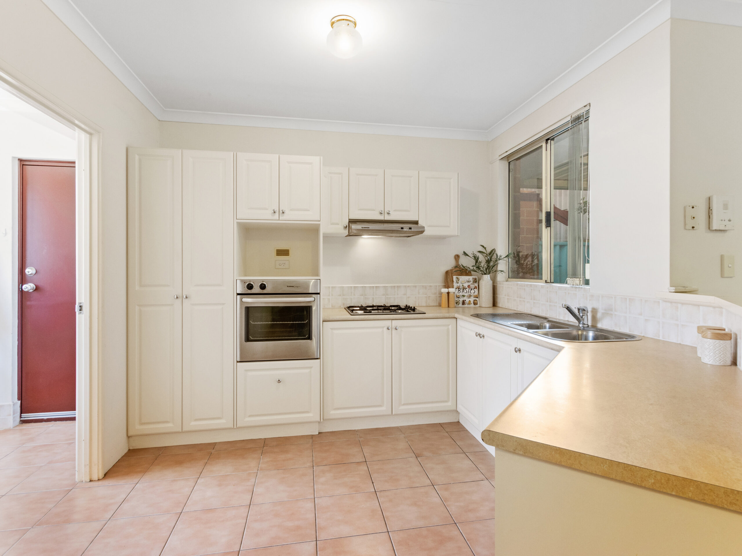 The kitchen is a true highlight, featuring a double sink, gas stove top, stainless steel appliances, and plenty of cupboard and bench space. Meal preparation is made easy with a built-in pantry and ample storage.