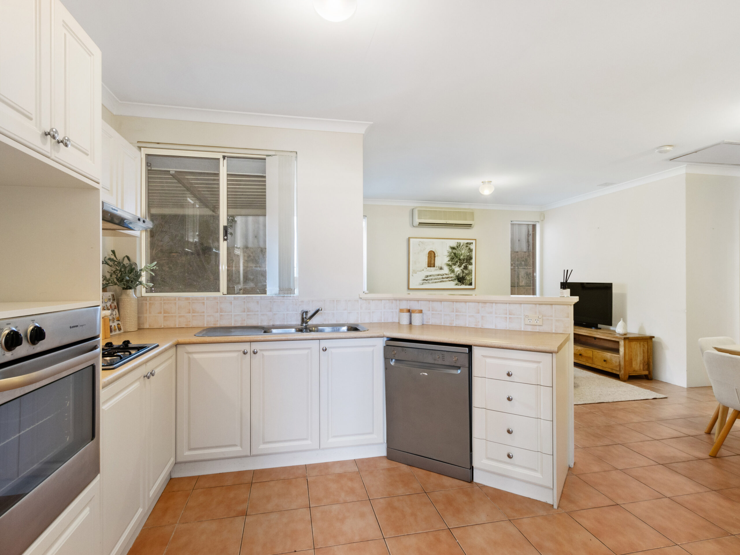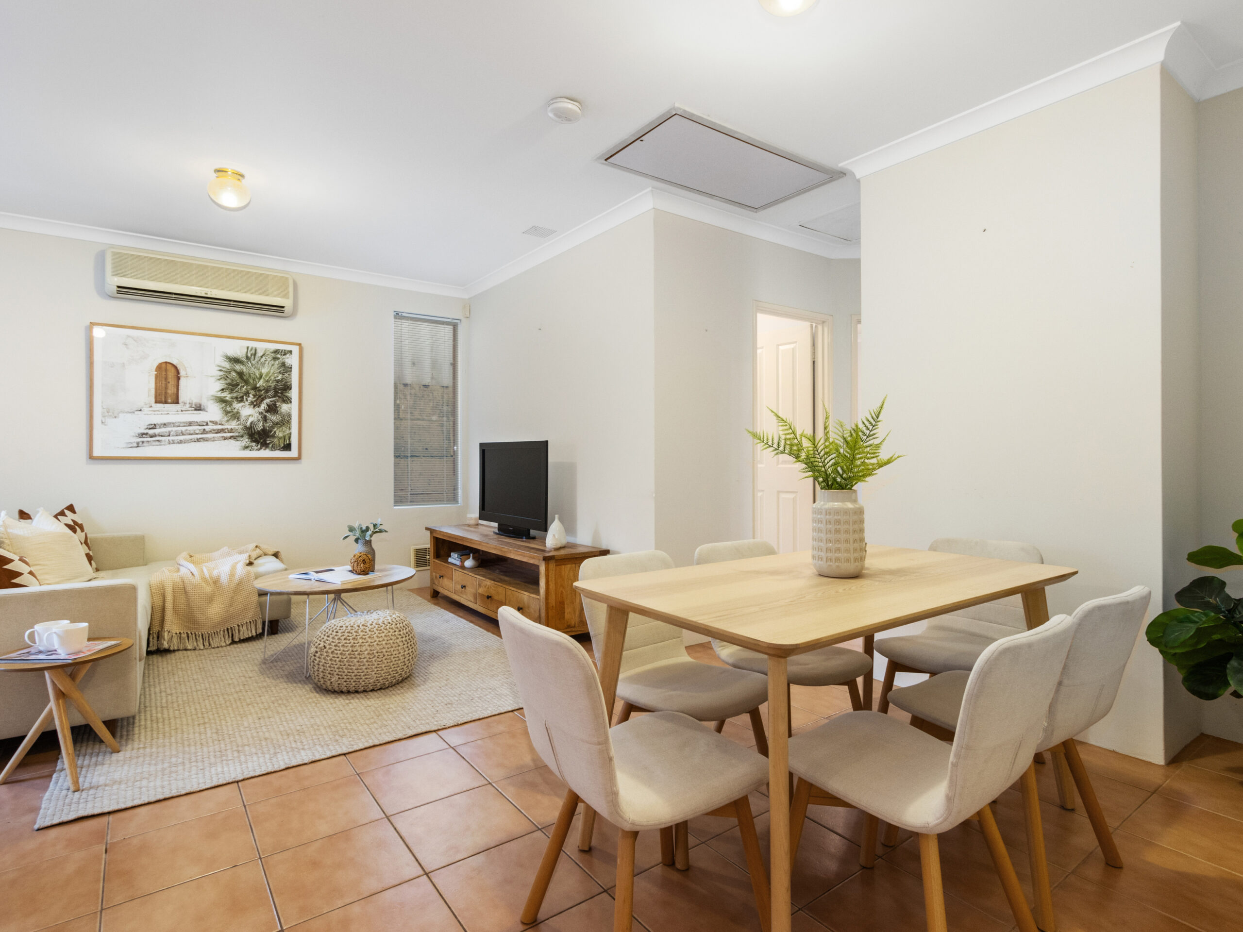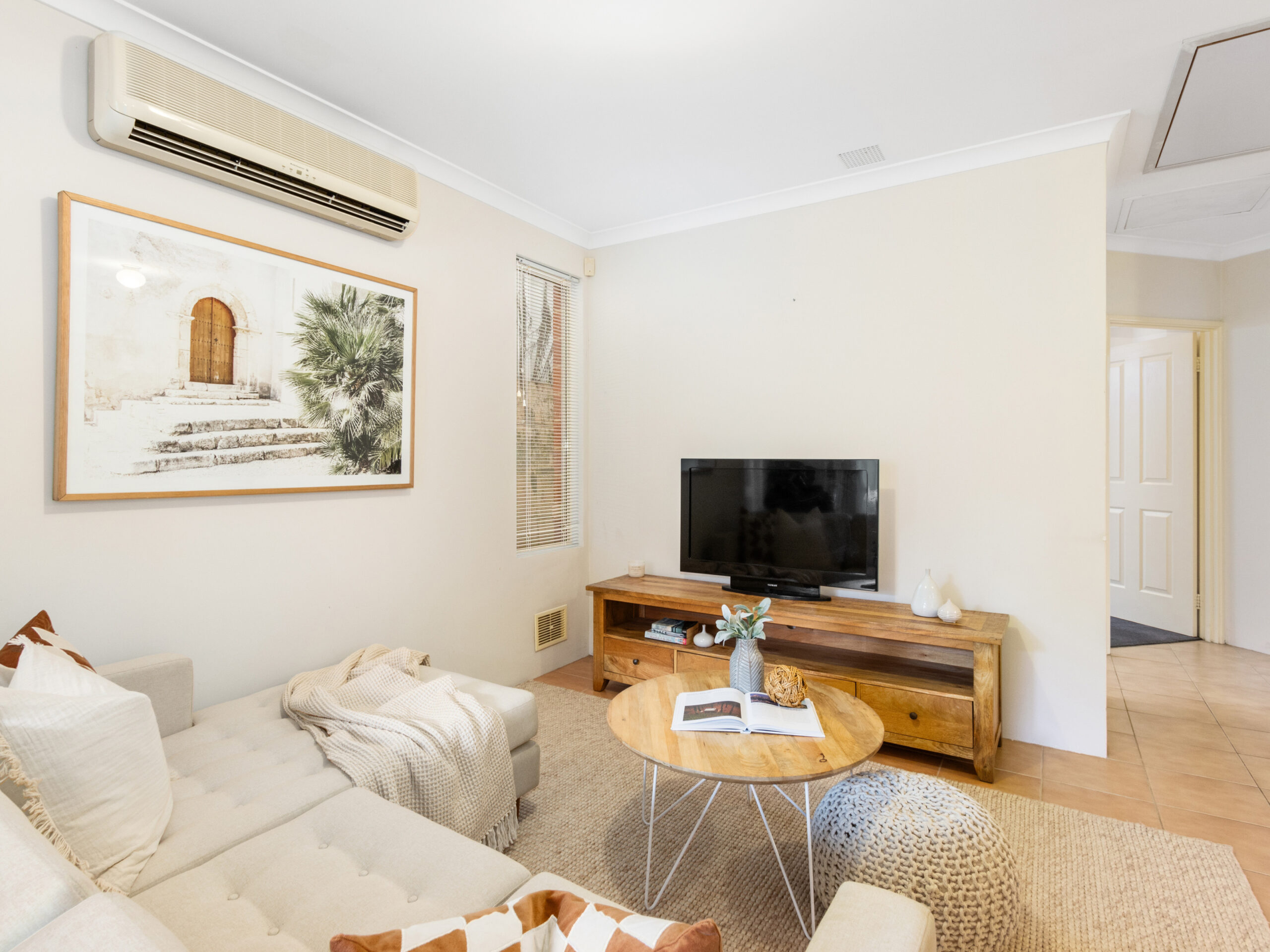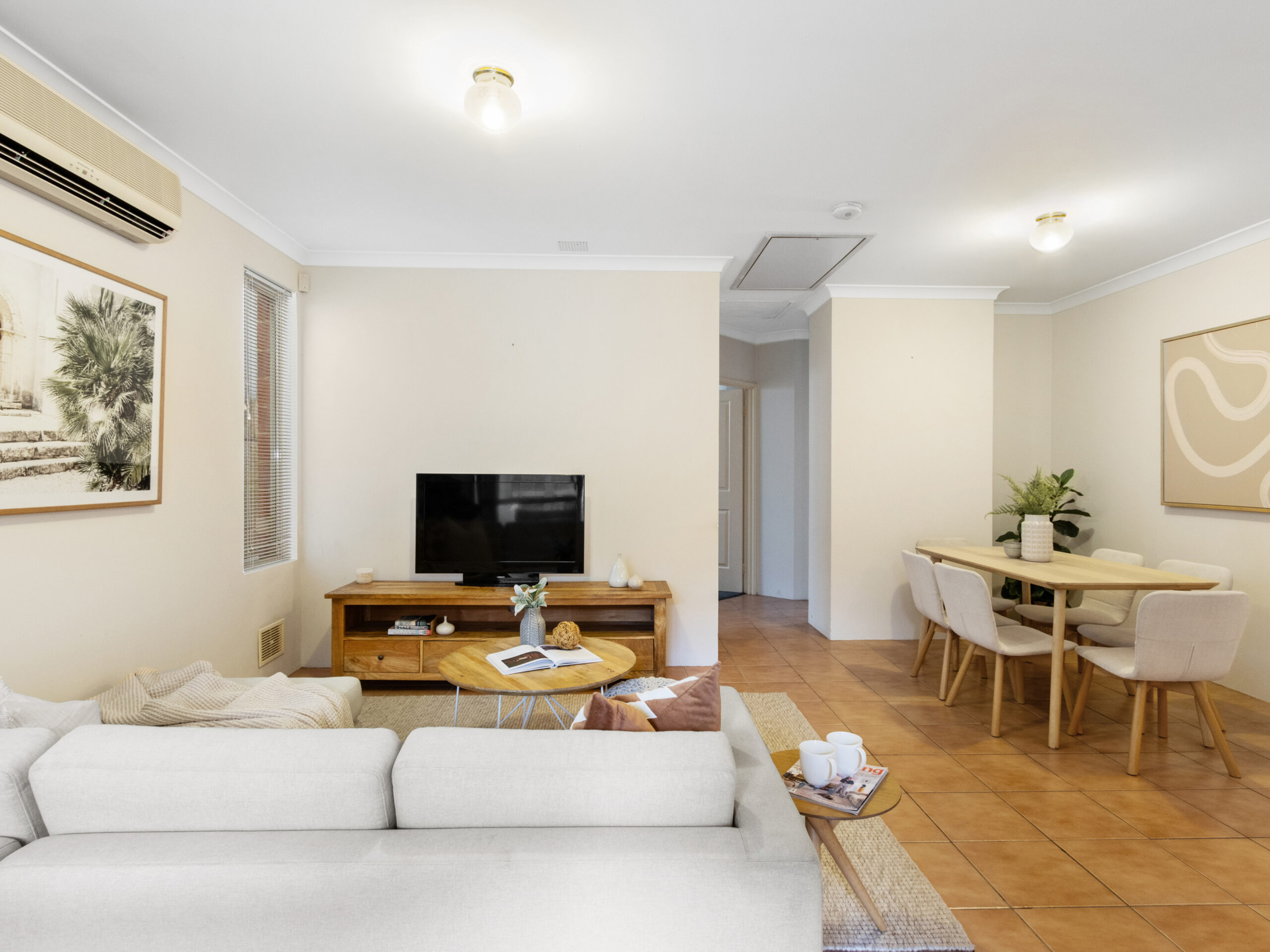 The heart of the home is the open-plan living, dining, and kitchen area, perfect for family gatherings or casual meals. This area is equipped with air conditioning, ensuring comfort all year round.