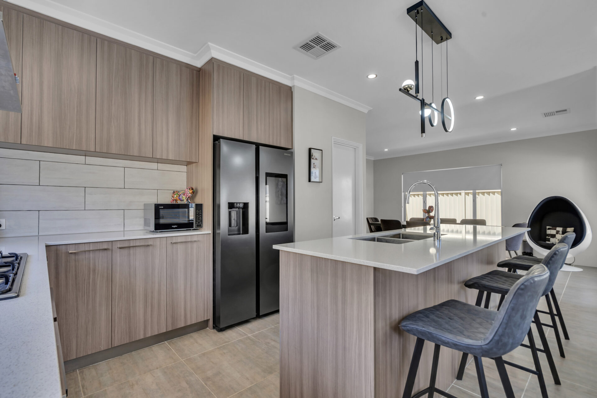 The well-appointed kitchen is the heart of the home, boasting a large island bench with double sinks, a walk-in pantry, and ample cupboard and bench space. It is conveniently positioned adjacent to the laundry for everyday ease.