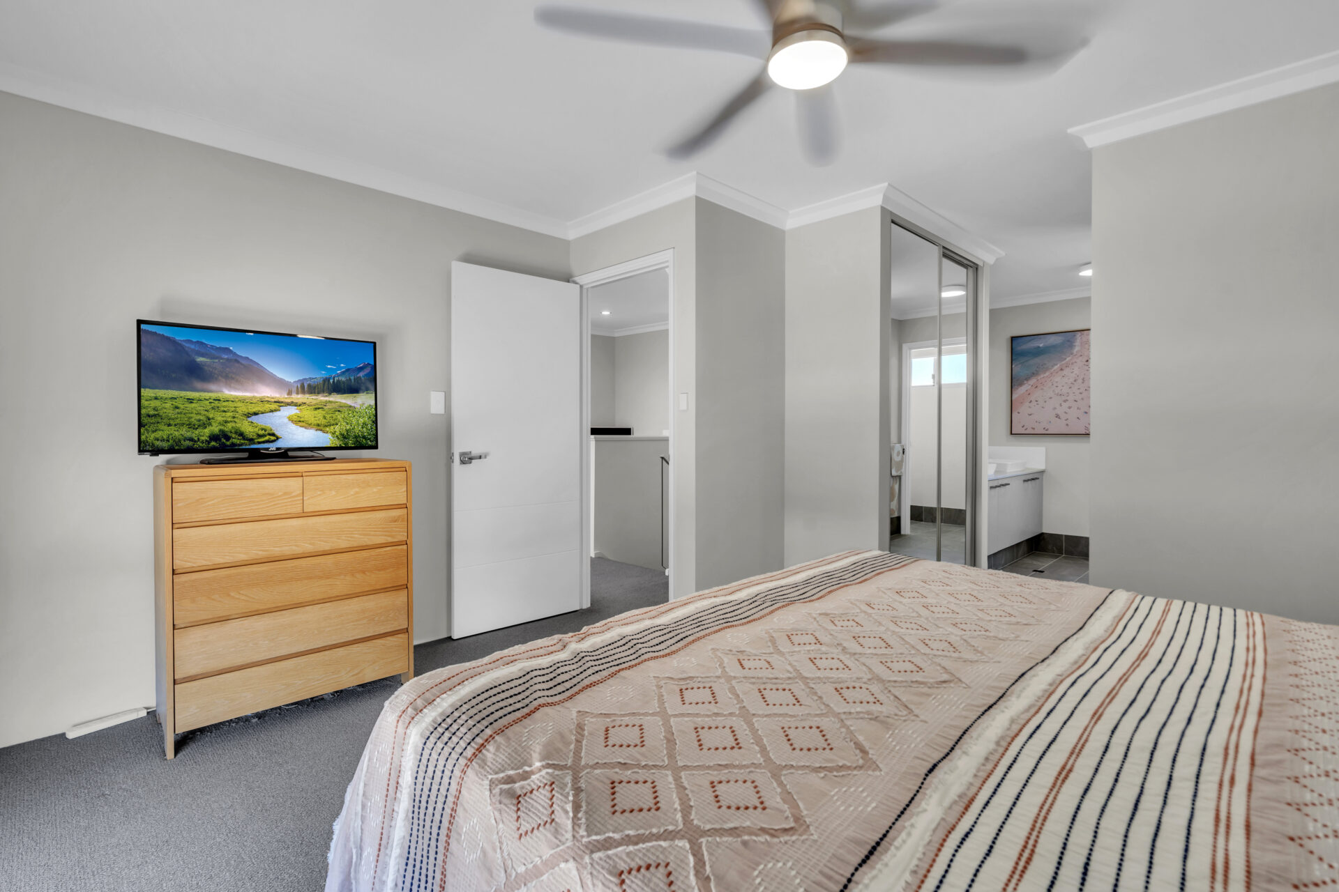 Downstairs, you are welcomed by an impressive entryway that sets the tone for the rest of the home. Two well-sized minor bedrooms (Bedrooms 2 & 3), both complete with built-in robes, are ideally positioned and serviced by a central main bathroom featuring a full-size bath, separate shower, vanity, and a separate toilet/powder room for added convenience.