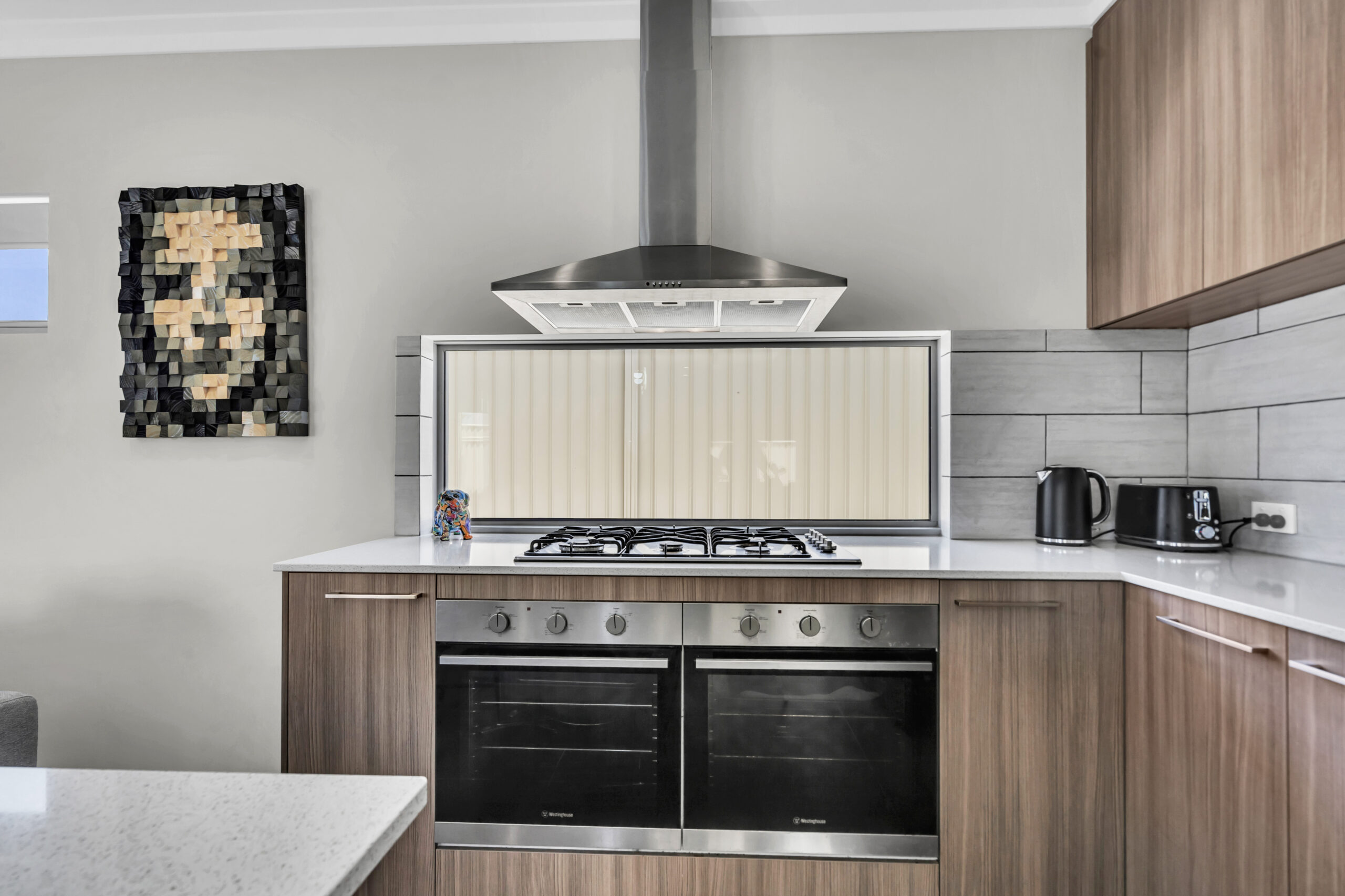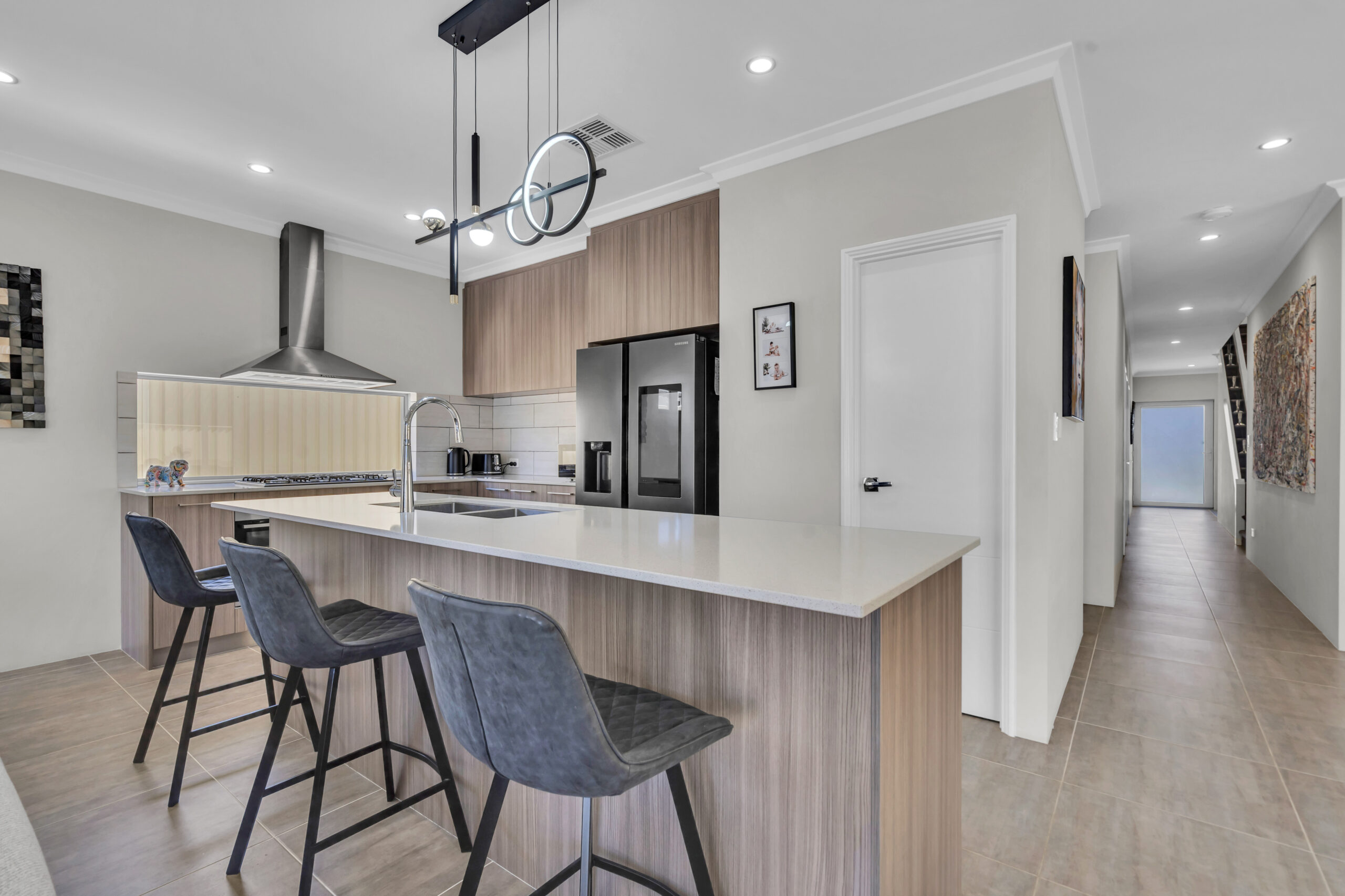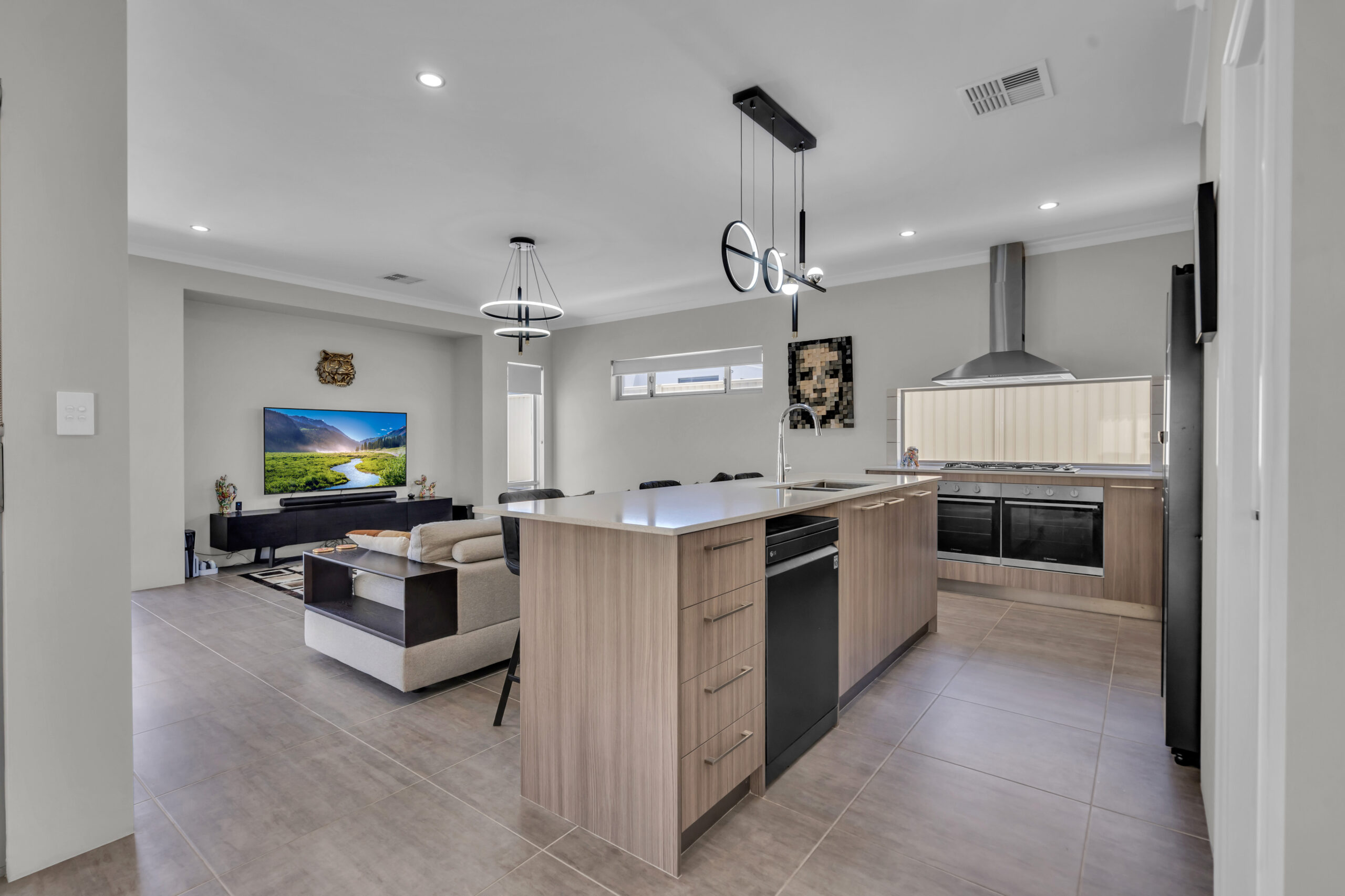 The well-appointed kitchen is the heart of the home, boasting a large island bench with double sinks, a walk-in pantry, and ample cupboard and bench space. It is conveniently positioned adjacent to the laundry for everyday ease.