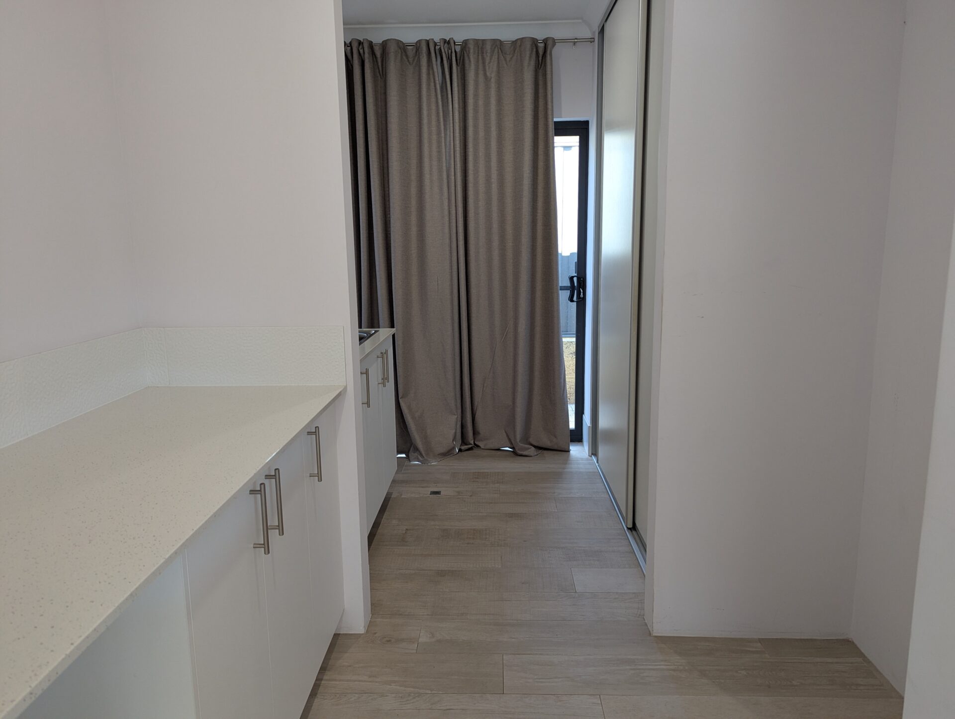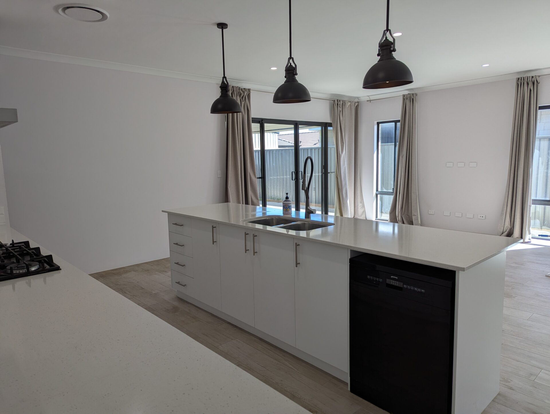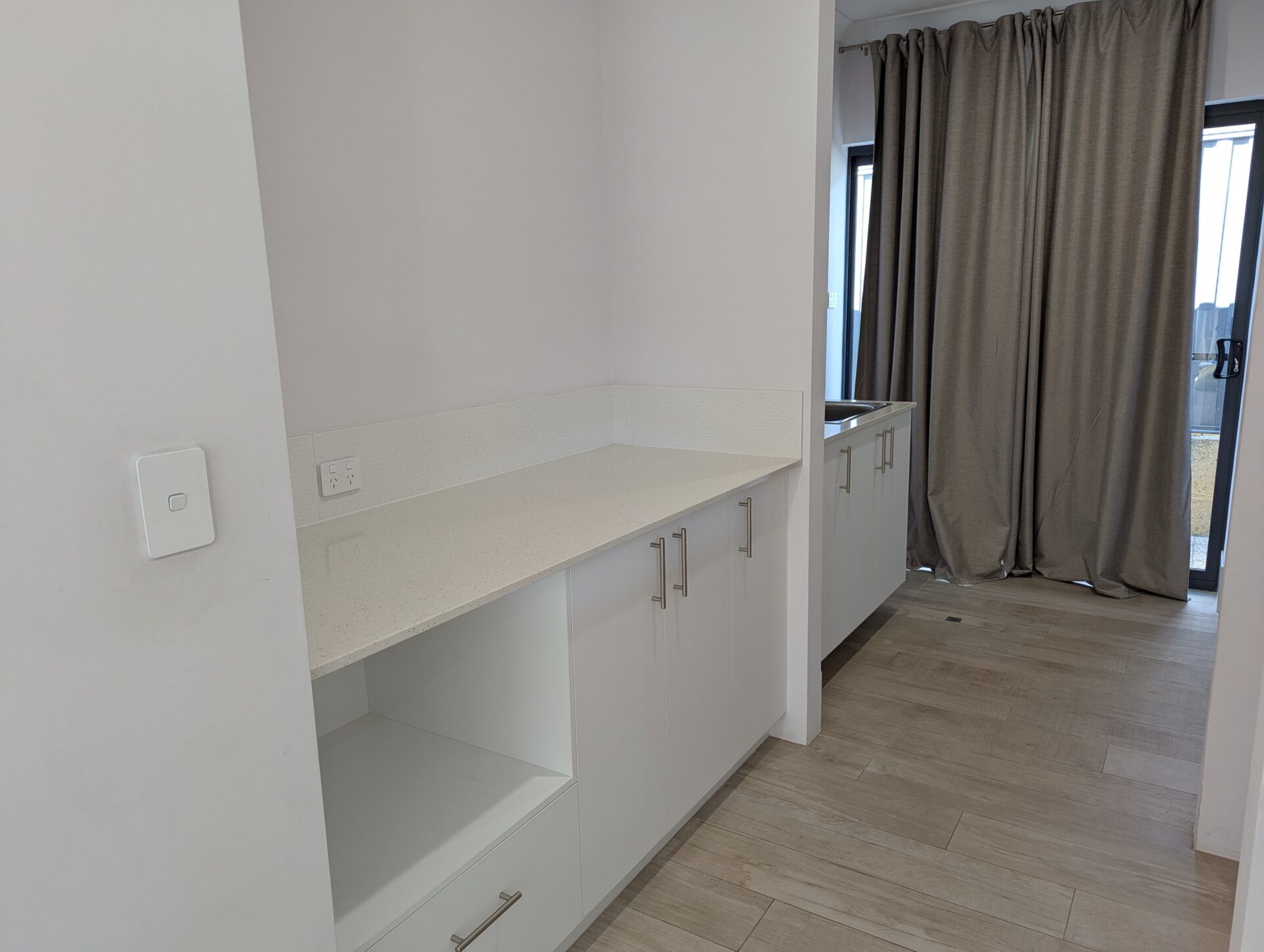 At the heart of the home is the open-plan kitchen, meals, and family area – perfect for everyday living and entertaining. The beautifully appointed kitchen features an island bench that doubles as a breakfast bar, a built-in pantry, ample cupboard and bench space, and a practical butlers kitchen for extra storage and preparation space. The laundry is conveniently located just off the kitchen for easy household flow.