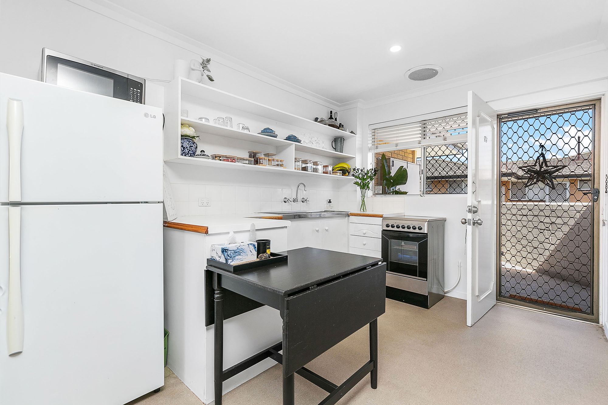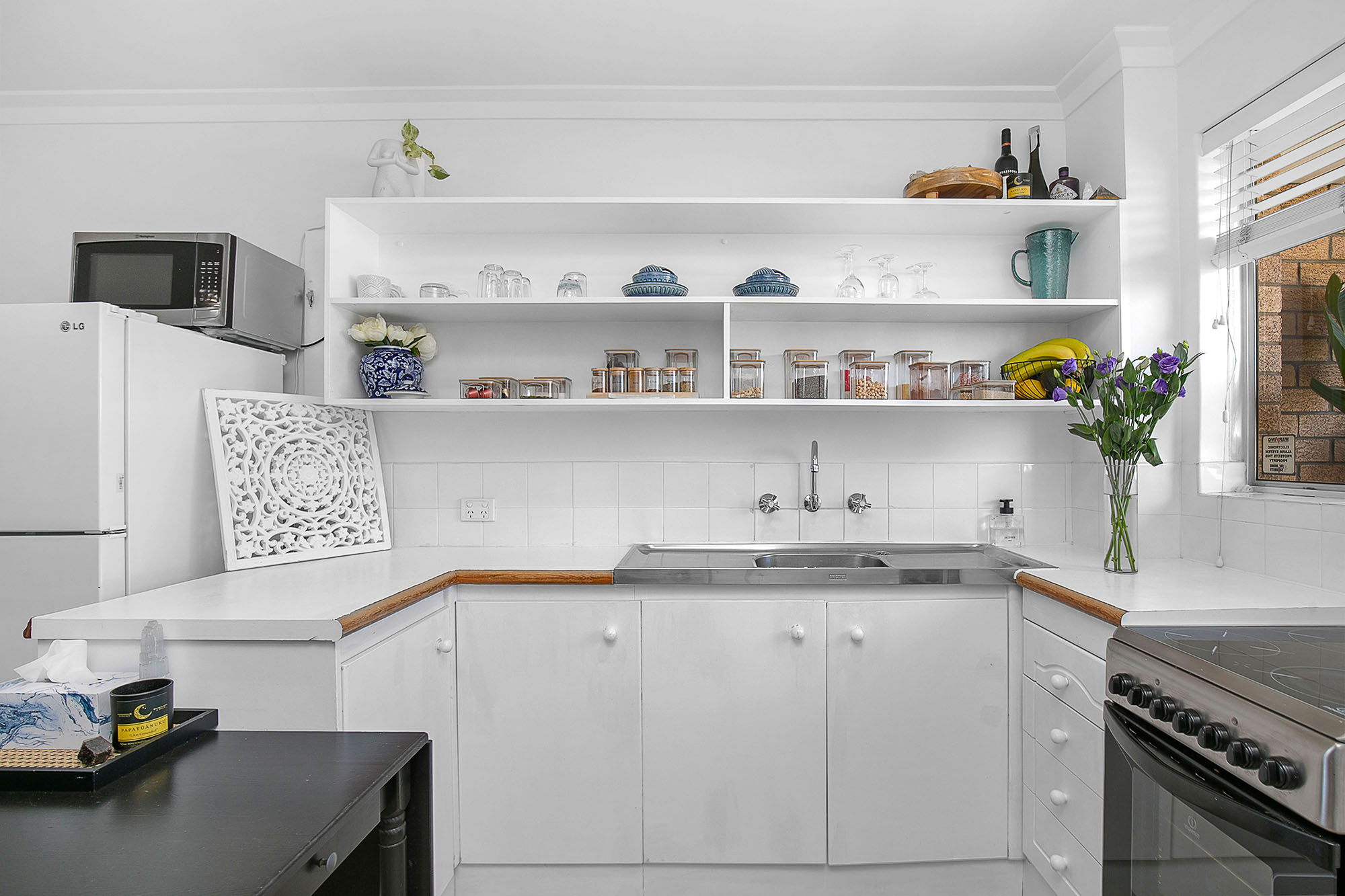 – Kitchen has stylish overhead open cupboards and a freestanding stainless steel electric oven.